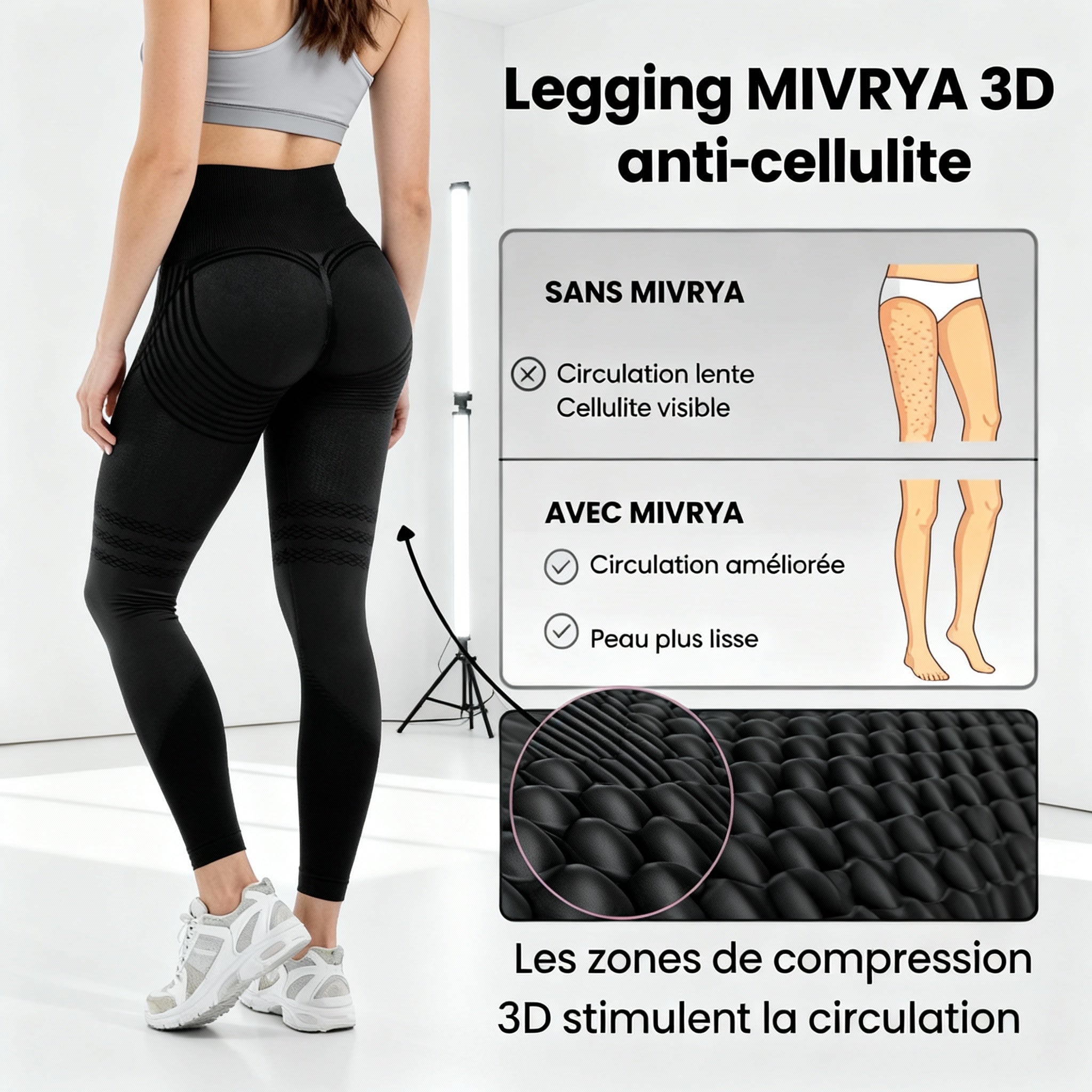 Découvrez le legging drainant MIVRYA, la technologie 3D qui stimule la circulation, affine la silhouette et améliore visiblement la texture de la peau - sans effort, juste en le portant.